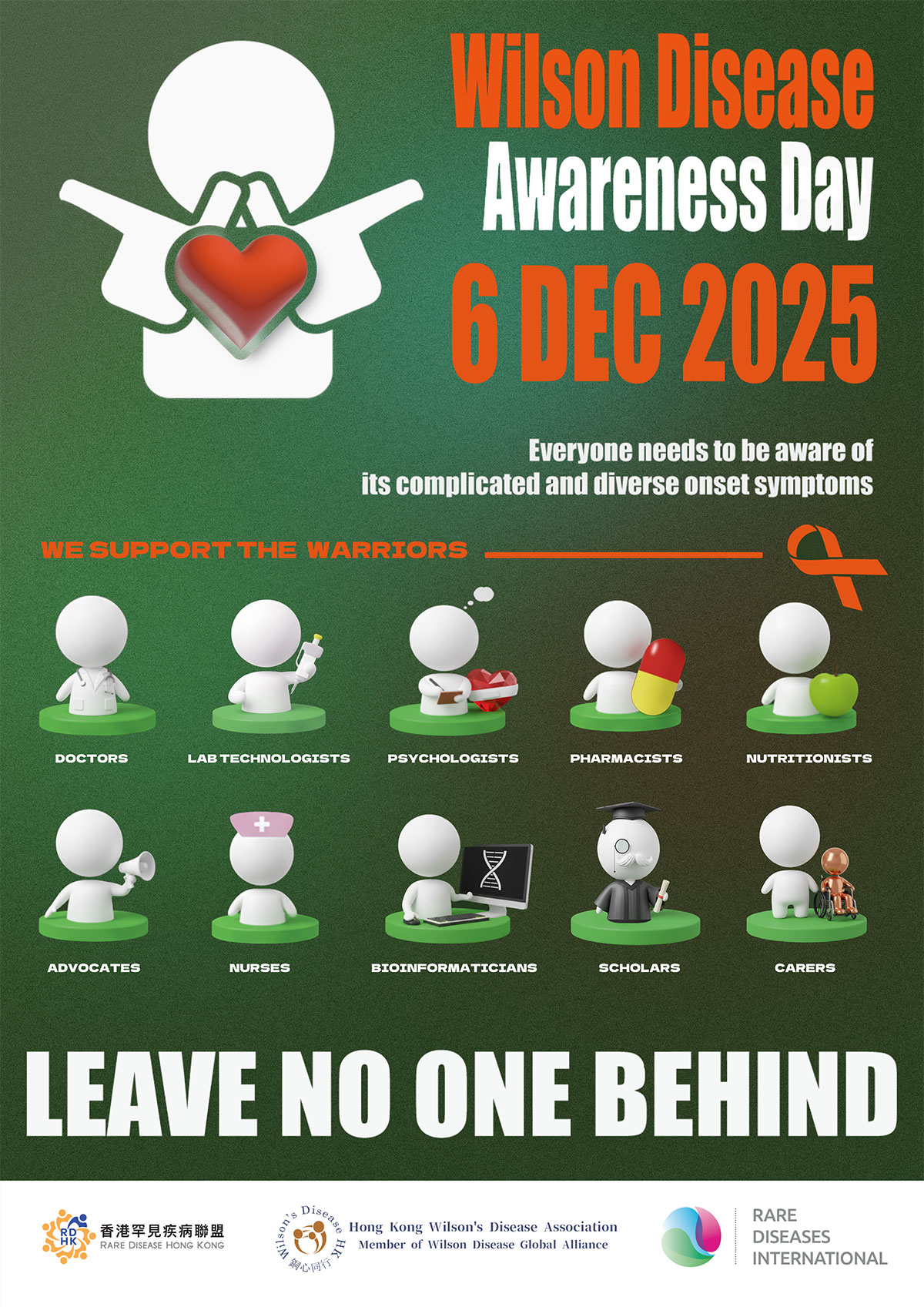 Thanks to the Hong Kong Wilson’s Disease Association, a proud member of Wilson Disease Global Alliance, for sharing this image to mark Wilson Disease Awareness Day. We also extend our gratitude to Rare Diseases International and Rare Disease Hong Kong for their support of Hong Kong’s promotional campaign.